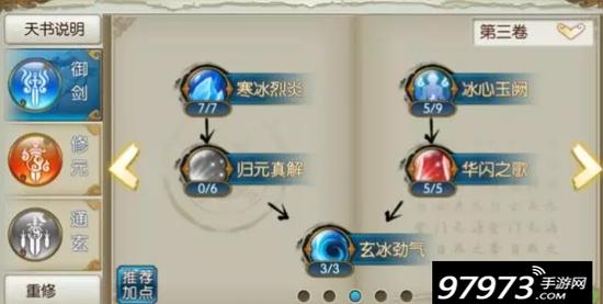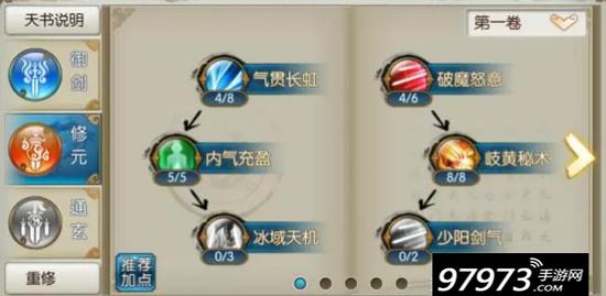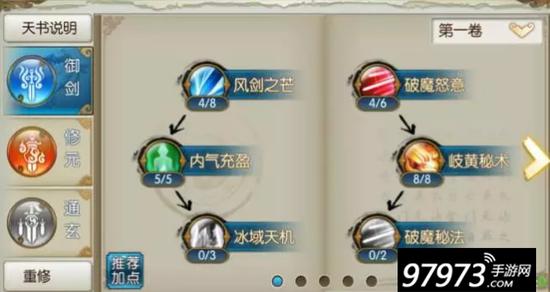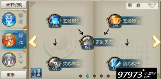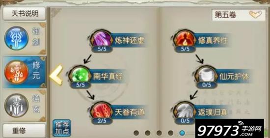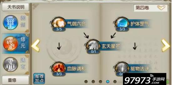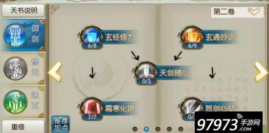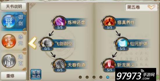 注:满级后,还有10点天书点,分别分配如下,御剑和修元第五卷修真养性各5点。