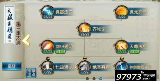 第三重,真雷法衣先diǎn一点,真元护体点满,剑心通明点满,天尊法身点满。如果第三重点完还有技能点多的点真雷法衣(如果没用天琊的优先点真雷法衣可以适当少点养生主)