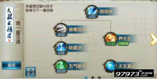 注:满级后,还有10点技能点数,把七劫斩龙决点满,其余9点加到黄帝内经即可。