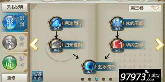 注:满级后,还有10点天书点,分别分配如下,御剑和修元第五卷修真养性各5点。