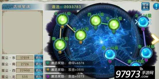 仙友可根据自身门派选择星魂进行镶嵌,拆解星魂可进行获得星尘用于shēng级,当一颗星魂达到满级将开启下一个镶嵌孔。