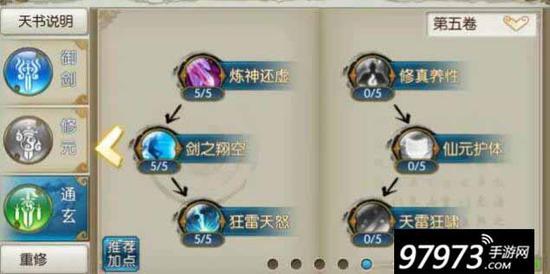 注:满级后,还有10点天书点,分别分配如下,御剑天书第五卷天眷有道与南华真经各五点。