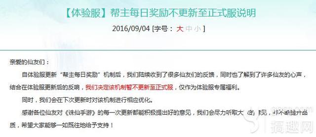 自体验服更新“帮主每日奖励”机制后,我们陆续收到了很多仙友们的反馈,同时也了解到了许多仙友的心声,结合在体验服更新后的反响,我们决定该机制暂不更新至正式服,仅作为体验服专属福利。
