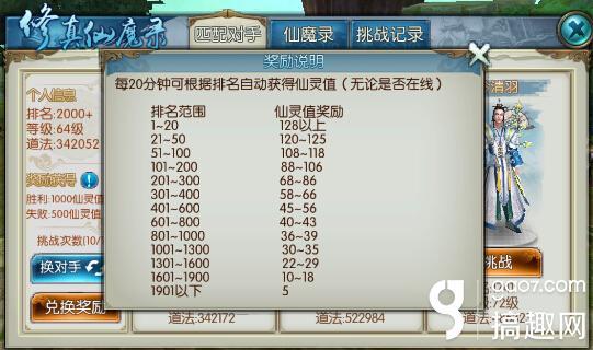 玩家所挑战的玩家名次越高,所得到的仙灵值也越多;