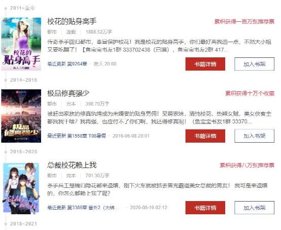 那么鱼人二代真的如许多网友所想的那样没有尝试过转型吗?也不尽然,在《校花的贴身高手》连载期间,鱼人二代还同时连载了多部小说,有些已经完结,有些直到现在还在连载,但是都没有再获得像《校花的贴身高手》那样的成功。