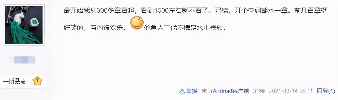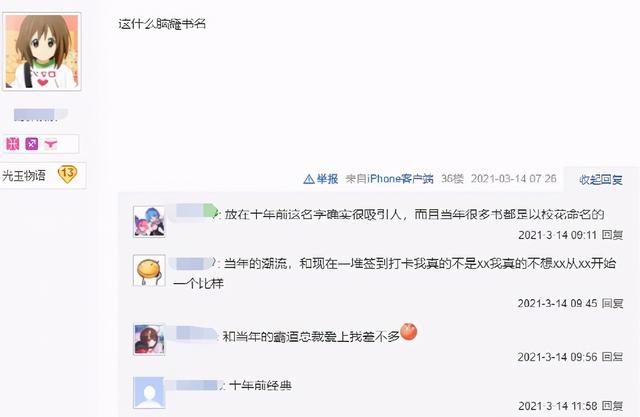 还有网友吐槽,这本小说的书名听起来非常的“睿智”,然而放在十年前,这种起名方式确实是一种潮流,只能说,鱼人二代已经水的跨越时代了。