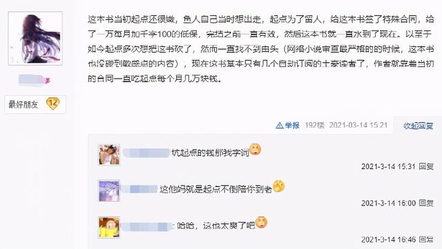 有网友表示,之所以会出现这种情况,是因为当初鱼儿二代火了以后想要离开起点,但是彼时起点并不想放这位知名作家离开,就与他签订了一个特殊协议,只要这本小说不完结,作者每个月就能拿到一万的、同时每写一千字就有100的低保。也正是因为这个协议,鱼人二代才会彻底放弃治疗,以水文的方式硬恰起点的钱。