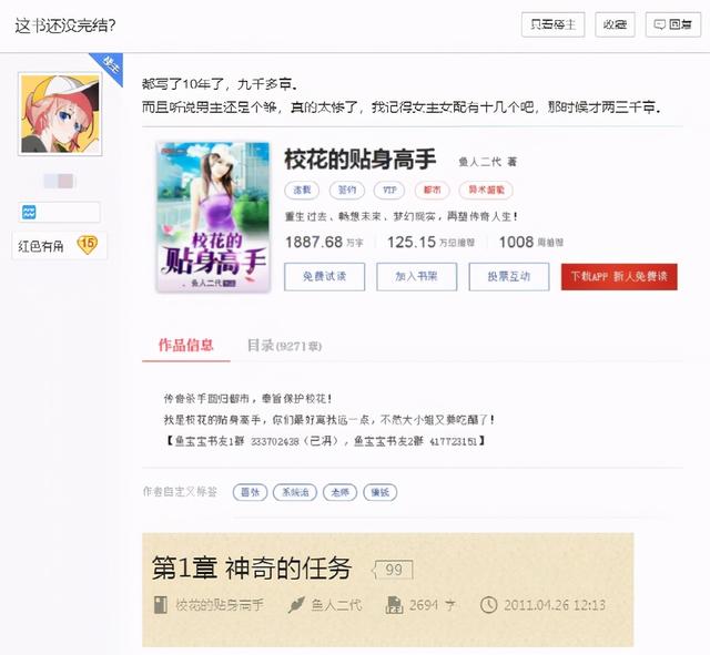 前两天,B吧有位吧友发帖,吐槽《校花的贴身高手》从2011年写到现在,写了九千多章都没写完,而且听说后宫成群的男主一直到现在都还是个雏。