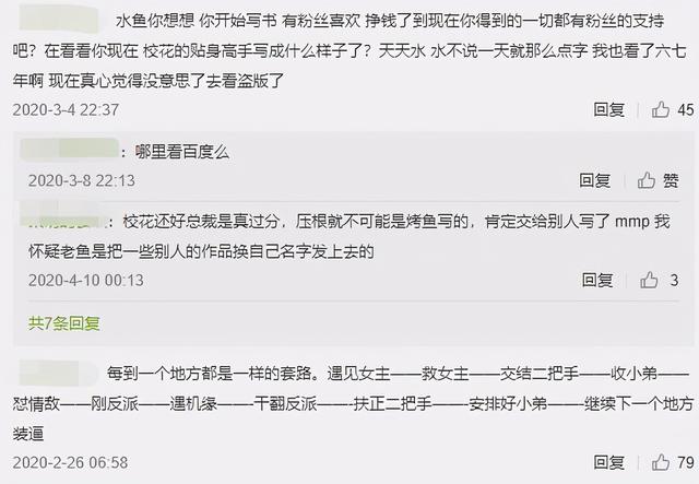 《校花的贴身高手》是许多人的青春,许多网文读者都或多或少对这本小说有些了解,因此该贴一经发出,就引发了众多网友的吐槽,有网友坦言,这篇文章开个空调都能水一个章节,作者鱼人二代不愧是水中贵族。
