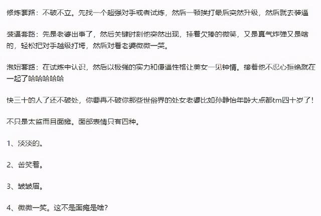 一开始《校花的贴身高手》还算是比较有趣,但是后来作者就开始摆烂水文,从都市系变到修真系,日复一日的修炼、装x、把妹,甚至有网友还总结出了文章的写作规律。