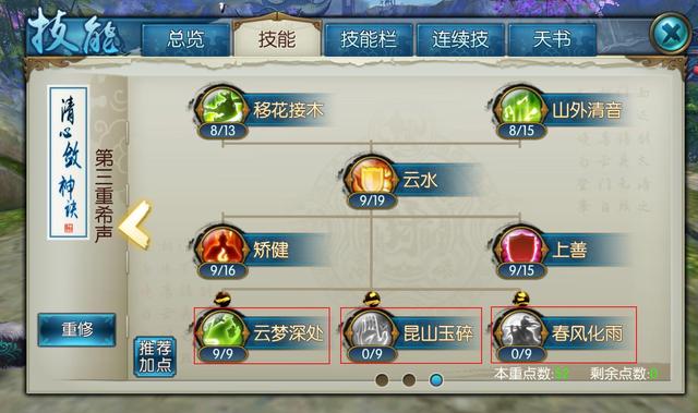以凤曲长鸣+百花缭乱+昆山玉碎为主要加点的常规输出路线,非常适合喜欢打副本、日常破凶偶尔打打帮战的玩家们选择,大量AOE技能可以非常效率的消灭低级小怪、而昆山玉碎以及百花缭乱相搭配使用也会对精英怪与Boss造成高额单体伤害。