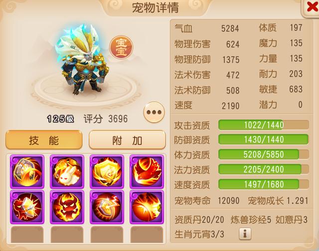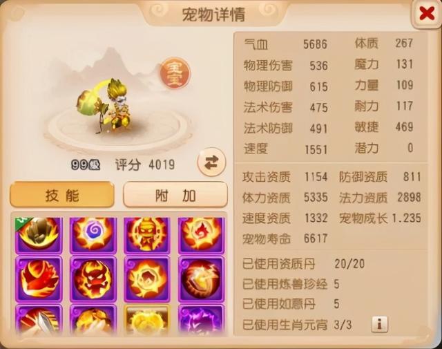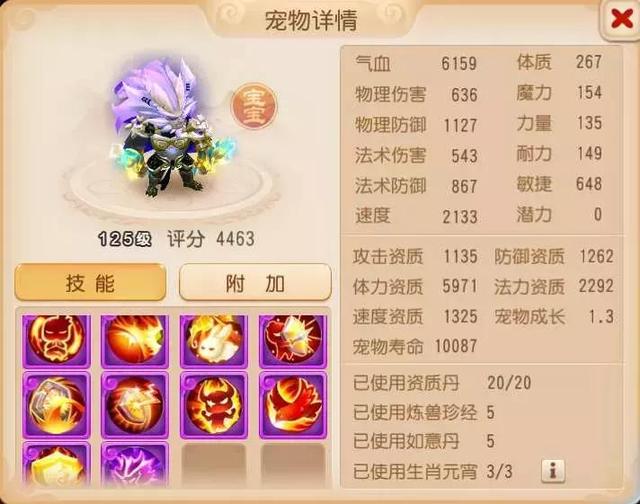 与前面那只嘲风相比,这一只嘲风的技能更加完美,甚至还有着能够无限续航的高级冥思!要知道对于双特殊技能的配速来说,这可是当之无愧的续航神技!5971的体资、1262的防资和1325的速资,可以说是相当的优异!再配上1.3的成长,这只嘲风简直是无敌的存在!