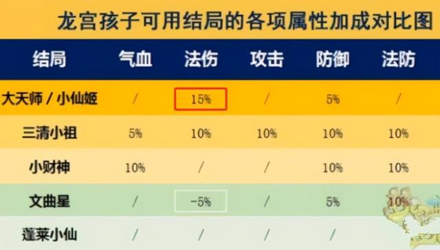 龙宫的孩子是可以拥有龙卷雨击技能的,龙卷雨击最多的情况下可以做到秒四,而且现在新版本的孩子可以学习多个召唤兽的技能,现在就有一些玩家在养成龙宫的孩子,但是仙族孩子的结局技能有多,上面就是仙族孩子的结局技能对于龙宫孩子的法术伤害加成的影响,在这里面大天师和小仙姬最好的,他们能够提升15%的法术伤害呢。