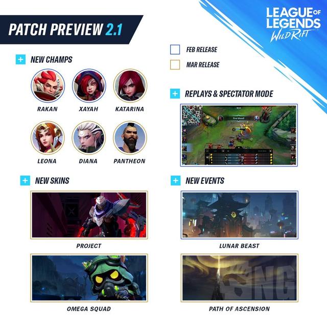 而在3月中旬的2.1c版本中,英雄联盟手游则是会推出三个新英雄,分别是“曙光女神蕾欧娜”、“皎月女神黛安娜”和“不屈之枪潘森”。这三个角色都是来自于巨神峰地区,是三个星灵化身的英雄。蕾欧娜是坦克辅助角色,有极强的控制能力;黛安娜是一个多重定位的角色,法系刺客和游击战士都能玩,具体要看游戏的数值加成,PC版本主要是单人线,但由于手游的野区机制不同,打野位置也是有可能的;潘森是一个游击战士角色,单人线和野区都能玩,手游的辅助位置则不确定。