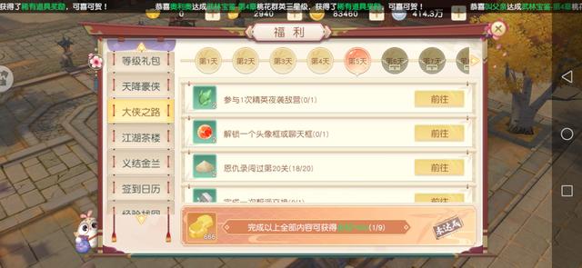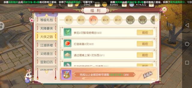 而且最最重要的是,"大侠之路"并不单单只是玩家获取奖励的一个好去处。其每天所发布的任务虽然内容不太一样,但是本质却都有助于玩家战斗力的提升。比如说下图中的"参加2次智闯绝情谷"任务吧,绝情谷是该款游戏中的团队副本,每次攻略完成之后都会给玩家提供大量的经验值。对于玩家等级的上升起到非常大的帮助作用。