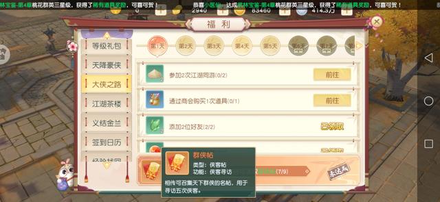 从玩家创建角色的第一天起,福利一栏中就会多出一个名为"大侠之路"的活动,玩家只要完成该活动中的全部目标便可以领取丰厚的奖励。而"大侠之路"将会伴随玩家整整21天,在这21天中,每天都有不同的任务目标等着玩家去挑战,而每天玩家们完成活动后所得的奖励也不尽相同。