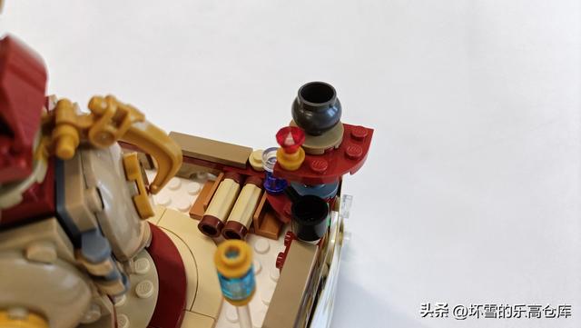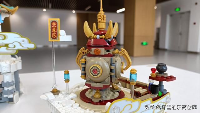 兜率宫的匾额,直接用透明杆件支撑,表现出浮于云端的姿态。场景主体就是大名鼎鼎的炼丹炉,是大圣火眼金睛的赠与者,也是下界火焰山的本尊。炼丹炉的门可以打开,内有透明橙色零件还原的三昧真火,同时空间可容纳一猴。