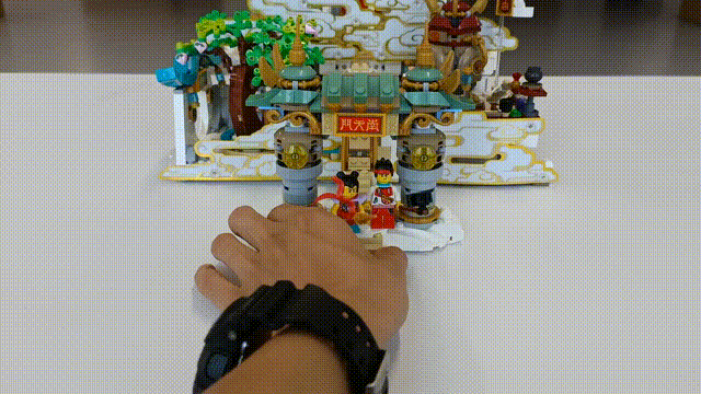 因此,本套装中使用了大量的白色颗粒来构筑祥云底板,加之金色和青色的色彩点缀其间,最大程度上还原了这座九天之上的神仙居所,整体看上去就像一座华美大气的戏台。同时,套装加入了大量机械件构建传动开关,推动南天门后的桥或者手动拉开两侧场景,就可以将场景展开,两大片金色祥云也顺势飘向两侧,让玩家立马有种身临天宫其境,拨开云雾见凌霄的澄澈清明之感。