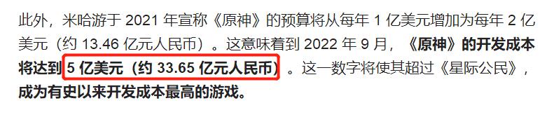 前段时间,有人统计《原神》或许会成为有史以来最昂贵的游戏,因为按照米哈游的官方报告,《原神》在2020年成功发行后,其预算从每年1亿美元增加到每年2亿美元。如果到2022年9月,每年2亿美元的预算保持不变,那《原神》的研发成本将大约会增加到5亿美元。