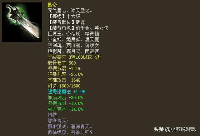 如果说上面那把武器还不太容易让人看错,那么接下来这个就真有点儿意思了……现在大话2里男人族忽视混的装备价格贵的要死,这把武器原始忽视7.1,算是非常漂亮的数据,再加上还有特技“碧海青天”,往下一看炼化“忽视10”,心里一阵美滋滋,但是却不曾想炼化里的忽视是“冰”而不是“混”!大家千万别觉得这种事是小苏自己乱说,之前发生类似的情况真的不在少数!
