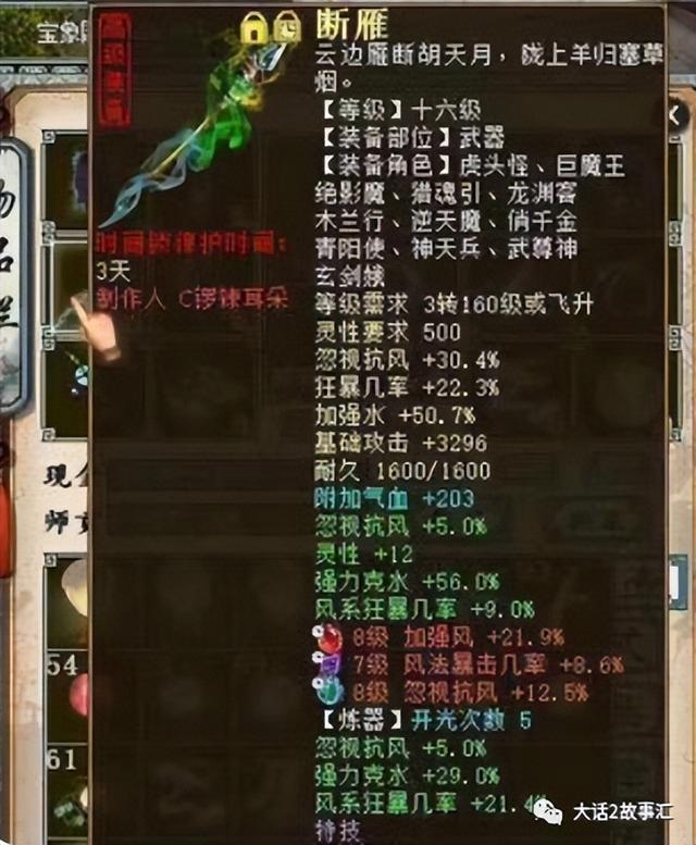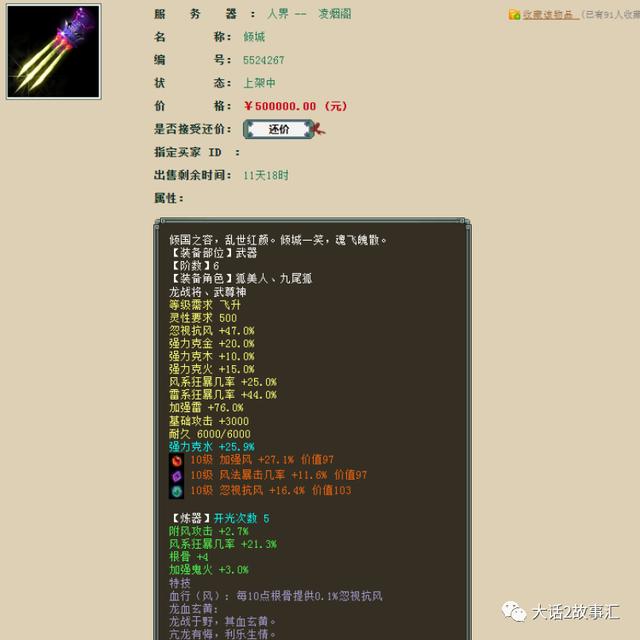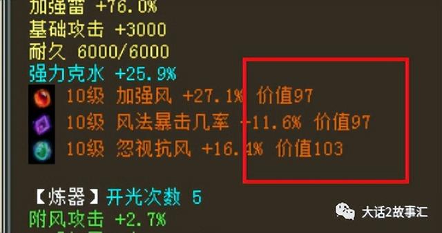 这把售价50万元的六阶仙器一起来看看,底子是忽视抗风加47,风系狂暴几率加25,蓝字是强力克水加25.9,炼器效果风系狂暴几率加21.3,根骨加4,特技是血行风,每10点根骨提供0.1忽视抗风。如果有1000根骨的话,那么就能提供忽视抗风10。总体而言的属性大概是忽视抗风57,强力克水25.9,风系狂暴几率46.3。