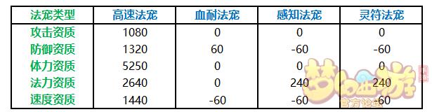 再来看看资质对比,比较惊艳的是感知法宠和灵符法宠居然有2880的法力资质(高出240)。