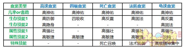 从生存技能来看,死亡血宠和高速血宠对攻宠的抗性略高一些,其中高级反震的适用面更广一些,高级防御除了提供属性外,只能对壁垒的高强力进行克制。
