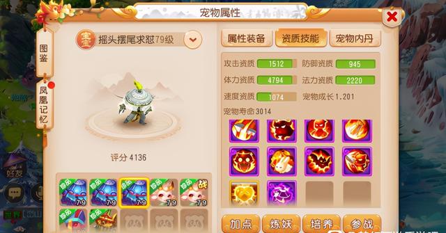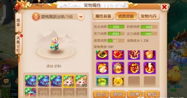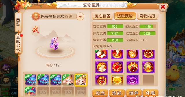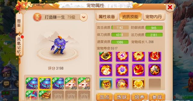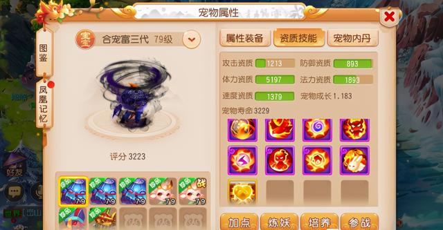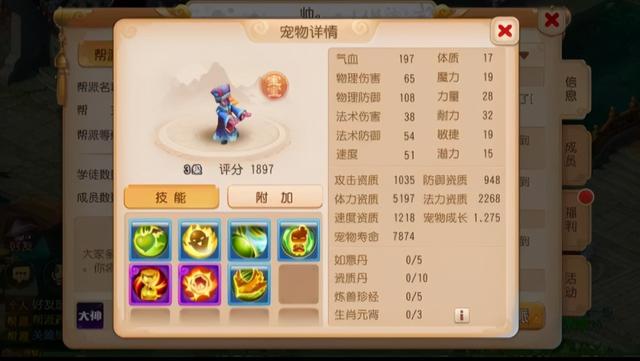 这只宠物的资质也太爆炸了吧!所拥有的5197体力资质与2268法力资质都已经超出了属性上限,而成长值更是达到了恐怖的1.275之高,在属性方面可以说属于精锐组第一梯队!而技能方面,在认证了群法技能后,打上大量增强输出与生存(包含高级鬼魂术)的技能,再配合激活专属内丹与专属装备的效果,立刻就能摇身一变成为认证8技能的“永动机”法宠!