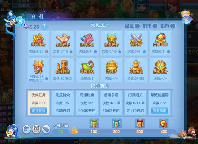以上是货币方面的内容,接下来和大家说说我们的"每日必做",它指的就是游戏中获得高收益高经验所要完成的任务,打开游戏界面中的"日程",我们可以看到很多每日的常规活动,有师门任务、宝图任务、丝绸之路、捉鬼任务、竞技场、英雄试炼、副本、每日挑战等等供玩家选择。
