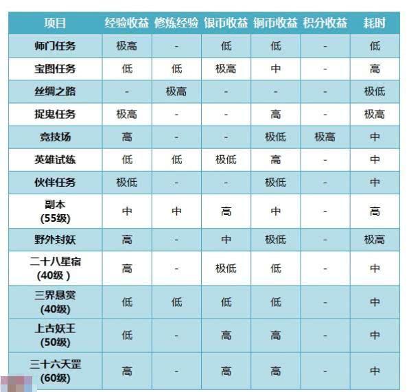 如果想要获得大量经验,可以优先完成师门任务和捉鬼任务,这两项任务的经验收益是极高的;如果想要获取银币,可以完成宝图任务,因为这项任务的银币收益较高,其他任务的收益情况可以看如图下表,玩家们可以按自身需求和时间安排来选择(野外封妖、二十八星宿、三界悬赏、上古妖王、封印古墓在日程-每日挑战里)。
