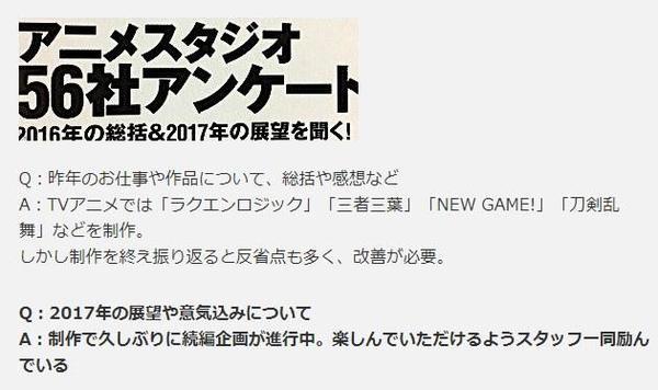近日动画工房的代表石黑龙接受了某杂志的采访,并在采访时透露,一个续篇动画的企划正在进行中,在杂志的采访中,记者问了石黑龙关于去年的作品的感想和总结。石黑龙表示:“制作了《Luck & Logic》《三者三叶》《NEW GAME!》《刀剑乱舞》等动画,但是制作完之后再回头去看有很多需要反省以及改善的地方。”而记者问到关于对2017年的展望时,石黑龙透露:“目前时隔许久的续篇企划正在进行中,充满期待的工作人员们都在共同努力。”虽然在采访中石黑龙并没有透露出到底是哪一部作品,但网友们纷纷猜测,认为是《月刊少女野崎君》的可能性会大一些。