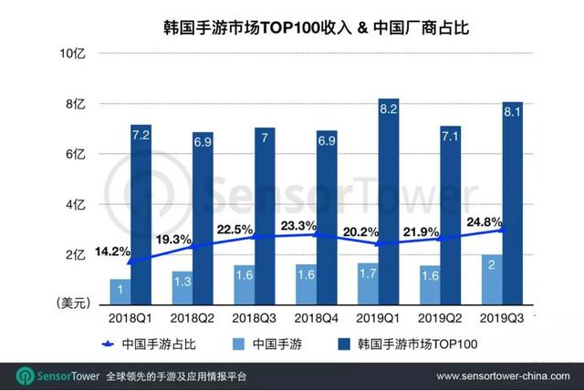 在总体营收上,国产手游也是收入可观。第3季度,韩国TOP100手游在App Store 和 Google Play 的总收入达到8.1亿美元,中国手游数量达到38款,收入占比达到24.8%,约为2亿美元。为有史以来最好的成绩。