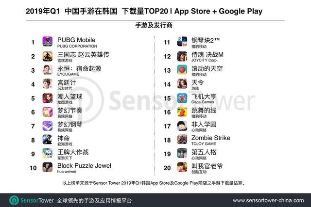 第1季度韩国下载量最高的中国手游是腾讯的《PUBG Mobile》,在韩国手游下载榜排名第4。