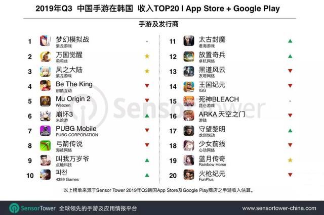 第3季度,中国手游仍是热度不减。紫龙游戏除了《梦幻模拟战》再次获得国产手游收入榜首名次,旗下新发行的《风之大陆》也表现不俗,排到收入榜第3。