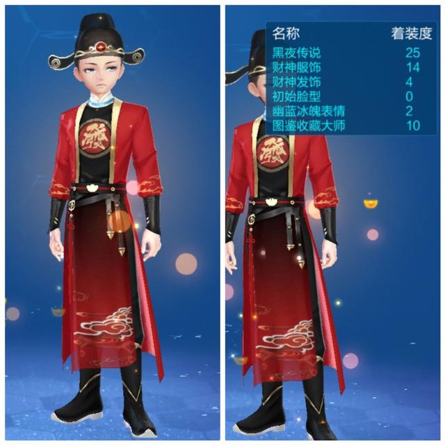 一顶金镶玉的乌纱帽,。 红色渐变的长袍,胸前绣着繁体的发字。腰间的缎带上有个十分显眼的元宝装饰,红色的中国结吊坠别在左侧。 搭配黑色的金丝长靴,尊贵的气息不经意间散发而出。有点像电视剧经常看见的当差官员的装扮。