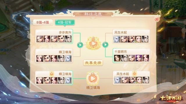 而在时间服的赛事中,来自精卫填海、风生水起、千里明月和步步高升四个服务器的代表战队夺得前四强,其中步步高升和千里明月两个服务器的战队将来到线下赛争夺最终的冠军之位。
