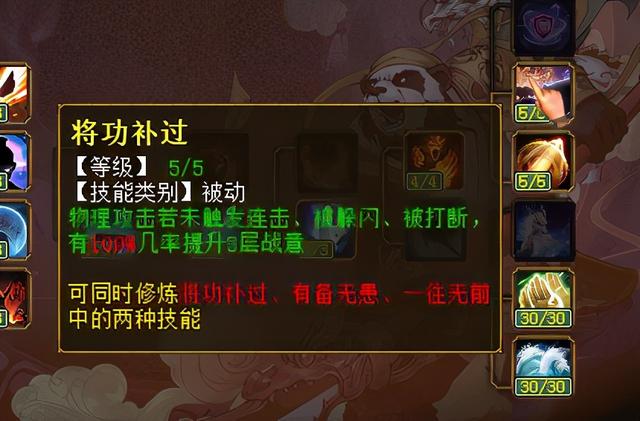 将功补过的重点在于:召唤兽失手(未连击、未命中、被打断)之后100%几率瞬间增加战意几率(额外分裂攻击一次,与高分、分化技能不冲突),大概率再砍一次,同时提升命中和忽视反震。