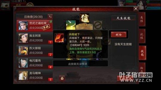 兵临城下技能效果:消耗自身50%HP和20%MP上限,使伤害提至2.5倍。注:HP或MP不足时无效,另外中“情网”法宝后无法使用。