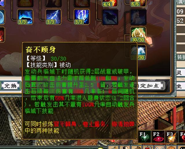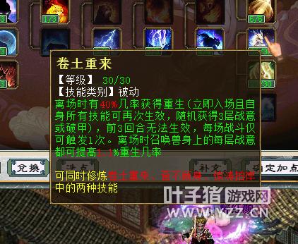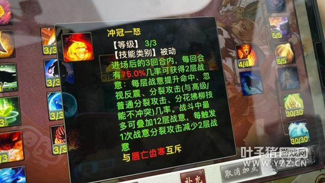 3、战斗过程中积累的战意(战斗中最多可叠加12层战意)可以显著去提升卷土重来的触发几率,理论上可以额外增加1.1乘以12=13.2%的卷土重来的触发几率,使卷土重来的触发几率提升至40+13.2=53.2%,大概率在吉人之外有第二条命,一个宝宝当两个宝宝用。