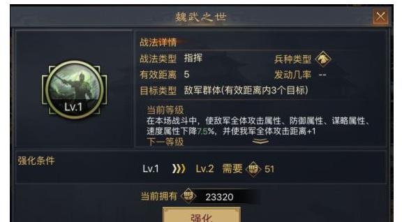下面来看看技能吧,率土之滨唯一的全体攻击距离稳定增加!对菜刀来说是强力辅助,对某些手短英雄有着很好的补充(徐庶张绣魏关羽等等)而满级15%的敌方3人全体四围降低,更是一个万金油的强力技能。到了征服赛季面对动辄五红的土豪,百分比降低四维可以直接把他从满红变白板!如果对于四围降低没有特别的实感的话,那么我换一种说法,这个属性减少可以看成是:敌方造成的所有伤害降低7.5%,受到的所有伤害提升7.5%,具体数值当然会因各种原因有所不同,大致范围就是这样。在S1的时候,大家比较明显的感受在于曹操很硬,而攻击距离的提升感觉除了对于徐庶关羽等超短手武将,对于其他人不明显,然后越往后,前锋的回马空城等技能越来越常见,这个攻击距离的增加的重要性就越是体现了出来。