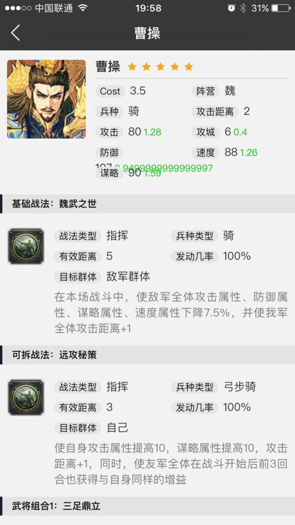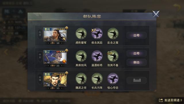再来说下搭配方面,毫无疑问曹操是做前锋的,由于技能既有万金油的属性部分,又有加攻击距离的辅助部分,所以搭配魏骑或者是搭配菜刀都是不错的选择,战法方面最常见的就是战必断金+反计之策,其他可以考虑的包括一夫当关这样的拉仇恨,或者擅兵不寡/青囊秘要这样的回血技能,三围好的武将,玩法会非常多,带什么都不吃亏。