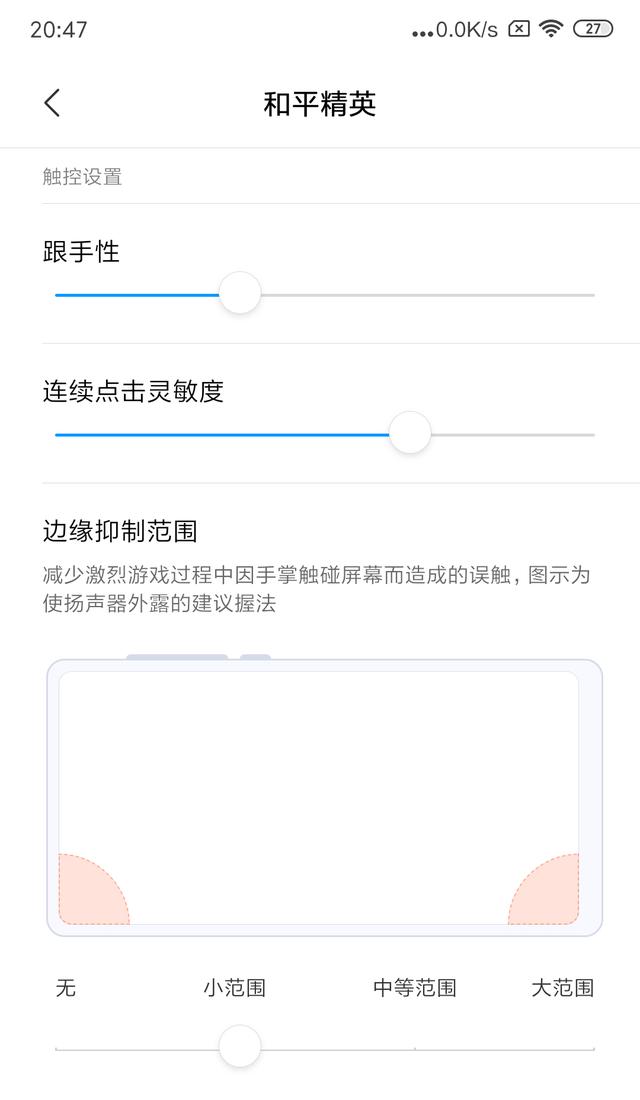 对于一款电竞手机来说,最重要的就是游戏中触控响应速度,它决定了玩家游戏操作的顺畅度。除了硬件层面的优化,Redmi K20 Pro还从系统软件层面支持针对单独每款游戏进行设置,用户可以自定义跟手性、连续点击灵敏度以及屏幕边缘抑制范围,以减少激烈游戏过程中因手掌触碰屏幕而造成的误触,甚至还可以模拟吃鸡游戏中开枪的震感。