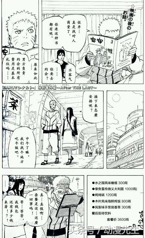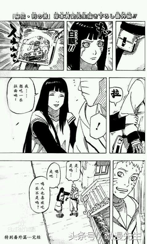 (番外)鸣人与雏田约会的时候,看了佐井的约会手册,对雏田说要请吃大餐,无奈囊中羞涩,雏田使用白眼发现其干涸的钱包,十分贤惠的没有点破,而是对鸣人说想吃拉面,拉着鸣人去了一乐拉面店。