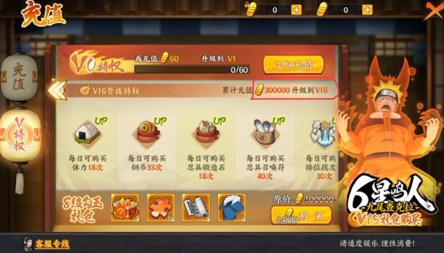 最后就是这个游戏的冲值福利了,反正有冲钱就有送很多好东西,而这个火影手游ol最高的vip等级居然有16级,要达到16级的vip需要累计3万大洋是不是觉得特别贵,想想现在3万能做多少事情了。王者荣耀最多也就8级vip,没想到这个比王者荣耀还高级,想想还是玩王者好了,就是不充值也不至于落后人太多。