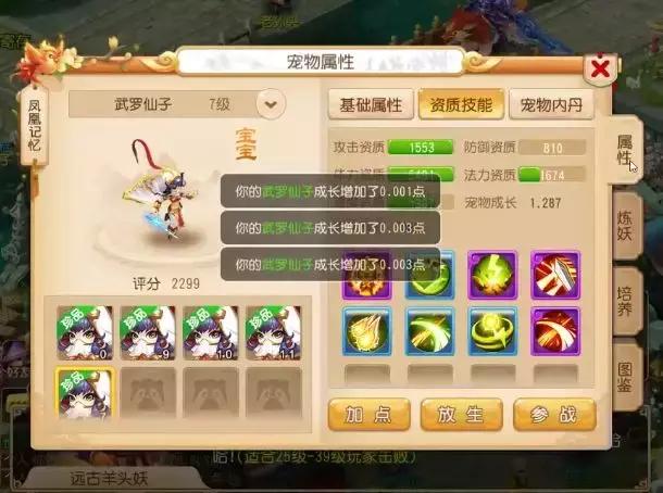 最后我们一起来看一下这只武罗仙子的属性,1553的攻击资质,5491的体力资质,1387的速度资质,吃完炼兽珍经以后的成长是1.287,无论资质还是成长都是非常的暴力!当一只攻宠再完美不过了。
