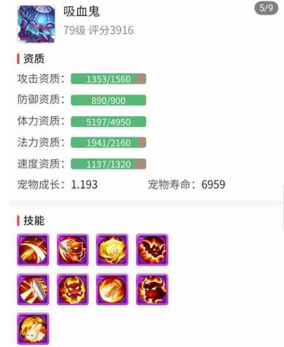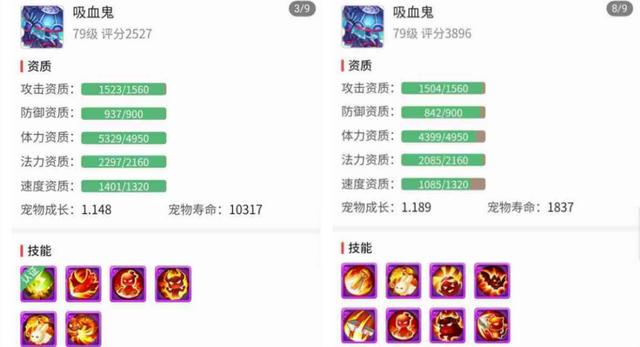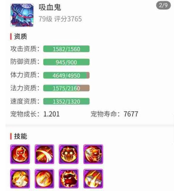 还有一只8技能吸血鬼同样非常养眼,其中1582的攻击资质,945的防御资质均突破属性上限,而4649的体力资质也接近于上限,搭配上1.201成长值,非常不错。在技能配置方面这只吸血鬼走的是隐攻的路线,在高级强力、高级必杀、高级连击、高级突进、高级偷袭技能的加持下可以打出不俗的伤害,同时还拥有高级感知技能,在玩家PK中能够占得先机,是一只出色的首发宠。