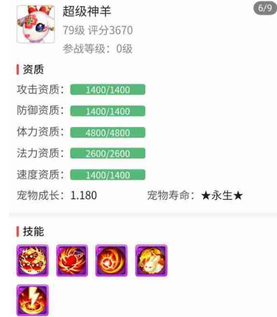 除了不错的装备外,这个角色的宠物实力也非常不错。这其中最引以为傲的是这只超级神羊,超级神羊想必大家都不陌生,专属技能三羊开泰拥有很好的“打蓝”效果,搭配高级法术暴击与高级法术波动技能后,在玩家PK中进行战术干扰非常好用,而在非玩家对战中能够汲取对方所损失的魔法值,几乎不用为了魔法储备而担忧,是许多辅助玩家都梦寐以求的神兽,在摆摊商城中售价不菲。