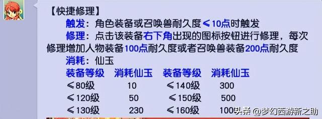 3、仙玉快捷修理装备。当角色装备耐久度小于等于10点时,点击装备右下角出现的的图标按钮进行修理,每次修理增加人物装备100点耐久或者召唤兽装备200点耐久且100%成功不会失败。这里附上修理各等级装备花费仙玉的消耗,这里推荐80以内的装备直接使用仙玉快捷修理。
