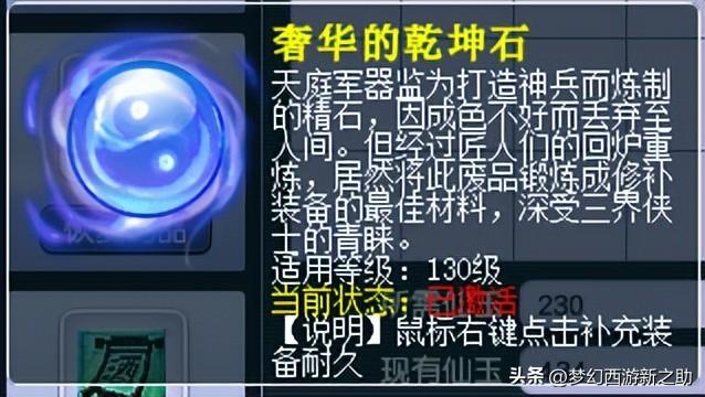 2、乾坤石修理装备。通过活动抽奖可以获得不少的乾坤石。可以恢复装备100点耐久度并且100%成功不会失败。
