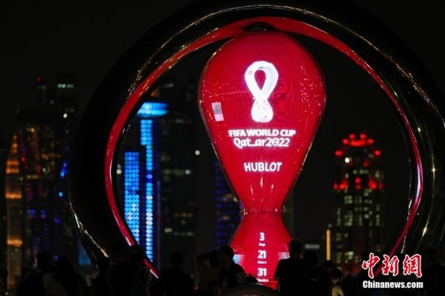 当地时间2022年11月16日,卡塔尔多哈,2022卡塔尔世界杯倒计时3天,球迷游览多哈夜景打卡纪念。图片来源:视觉中国